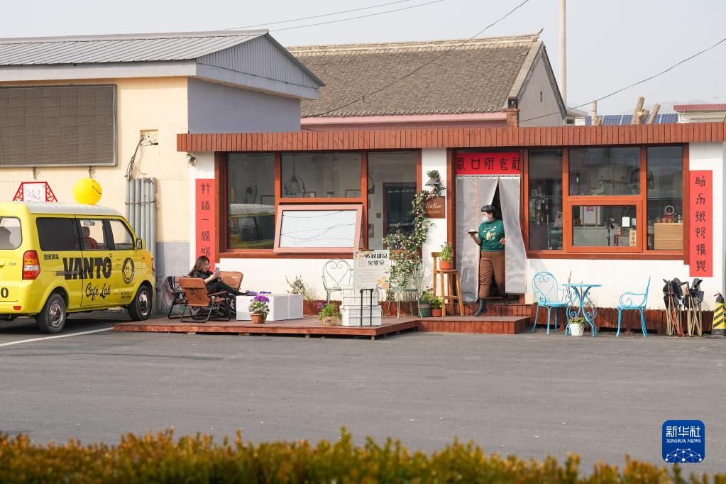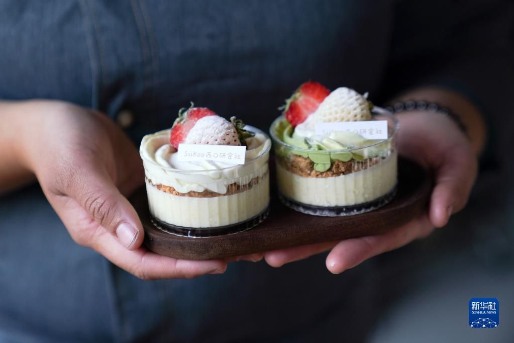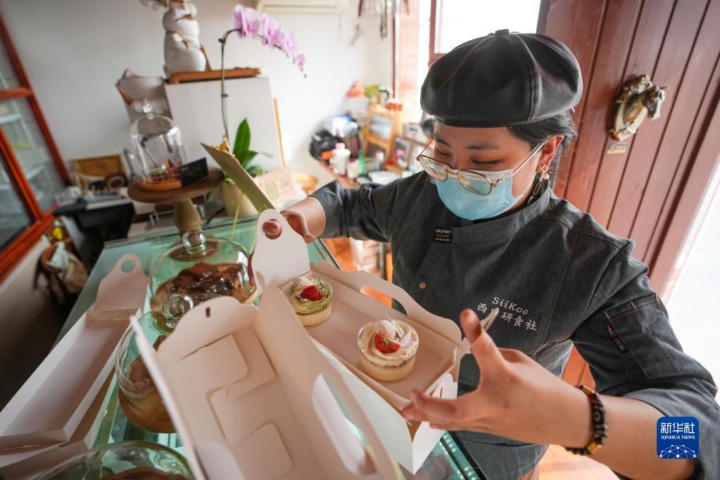 2021年底,来金叵罗村创业的刘甜恬在村西口开了一家甜品店,取名“西口研食社”,店里特色产品是她就地取材研发的“小米酥”,店里的员工也是她培训的本村大姐“三嫂子”杨红艳。像刘甜恬这样的来村创业者,金叵罗村还有很多,他们自称“金叵罗第十一生产队”,扎根乡村,丰富乡村业态,助力农村产业发展。图为在西口研食社内,刘甜恬展示自己使用了小米作为原料之一制作的新品小米布丁。