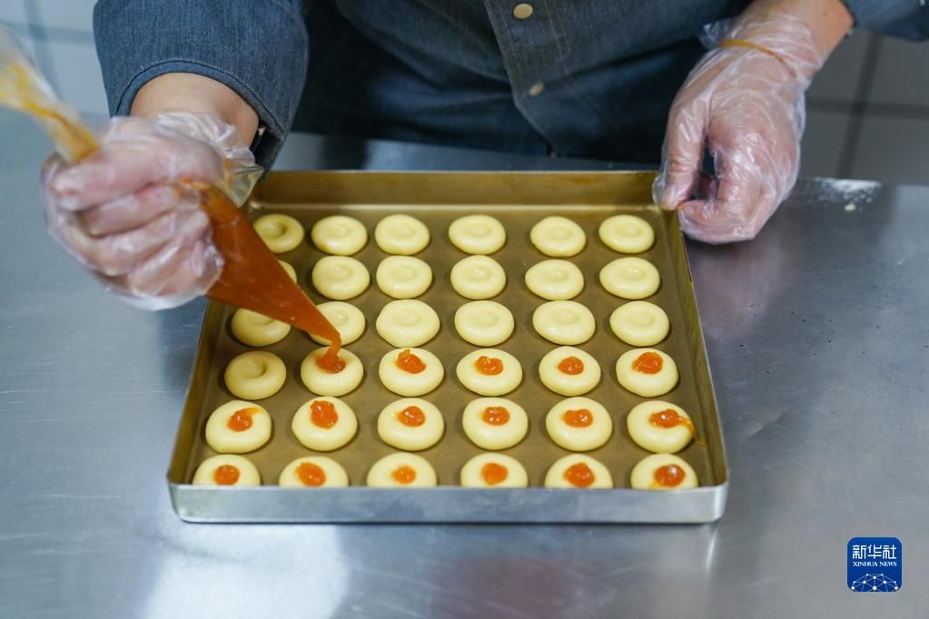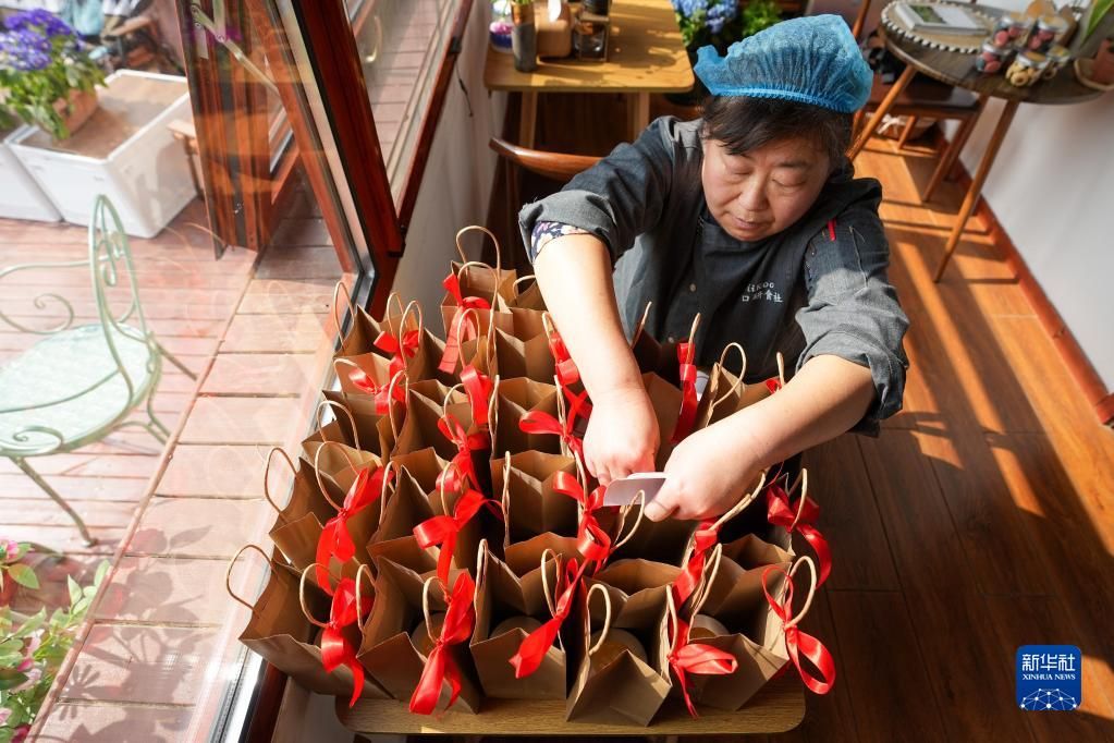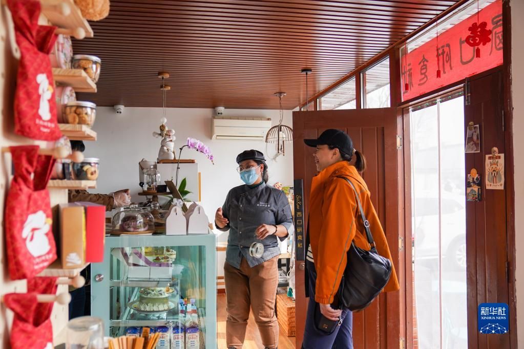 位于北京市密云区溪翁镇的金叵罗村三面环山,特产黄金小米,故得名“金叵罗”。近几年,金叵罗村大力发展乡村休闲旅游,支持年轻人来村创业,精品民宿、农场观光游逐渐红火。从小在密云长大的刘甜恬,知道金叵罗的小米特别好,就想把它融入西点制作,试着用小米和樱桃等原料去制作曲奇,于是金叵罗“小米酥”诞生了。今年春节,刘甜恬的小店贴上了村民手写的店名和“打造一流甜品,助力乡村振兴”对联。店里生意一直不错,刘甜恬充满信心:“希望我们的金叵罗小米酥产品走向世界,我也能为村子发展贡献自己的力量。”图为3月7日,刘甜恬在为来村里参观并进行小米酥制作体验的客人讲解制作流程。