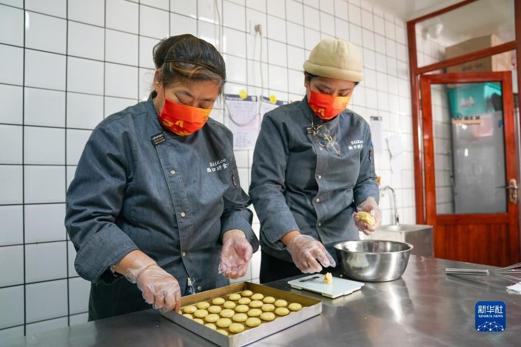 刘甜恬(右)和“三嫂子”杨红艳一起制作小米酥(2022年10月20日摄)。