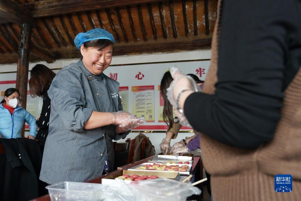 3月7日,“三嫂子”杨红艳(左)在为来村参观并进行小米酥制作体验的客人示范小米酥制作。