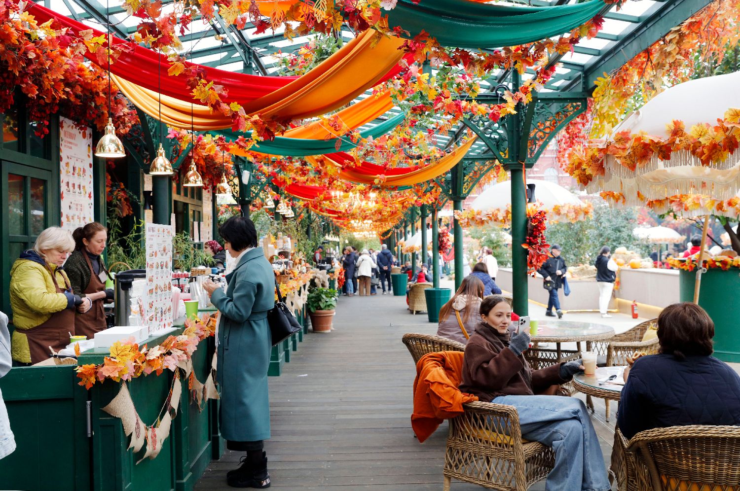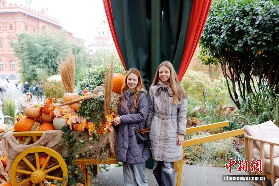 近日,“俄罗斯季节”——金秋美食文化节在首都莫斯科举行,人们在由上千形状大小各异的南瓜和菊花、干草等营造出的秋天氛围中品尝各种俄罗斯美食,欣赏音乐表演。图为10月8日,游客在俄罗斯首都莫斯科市中心的马涅什广场小憩。中新社