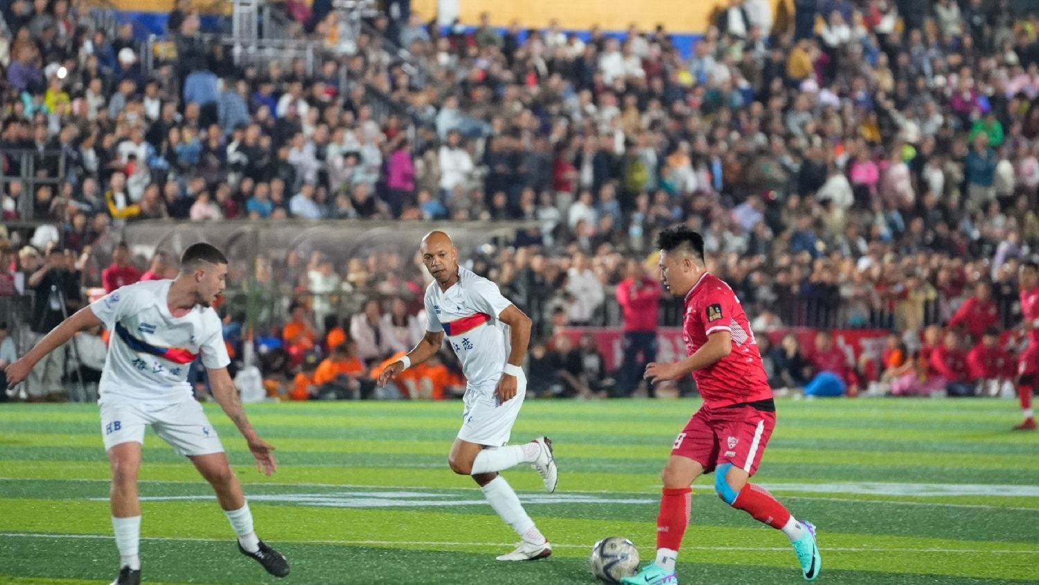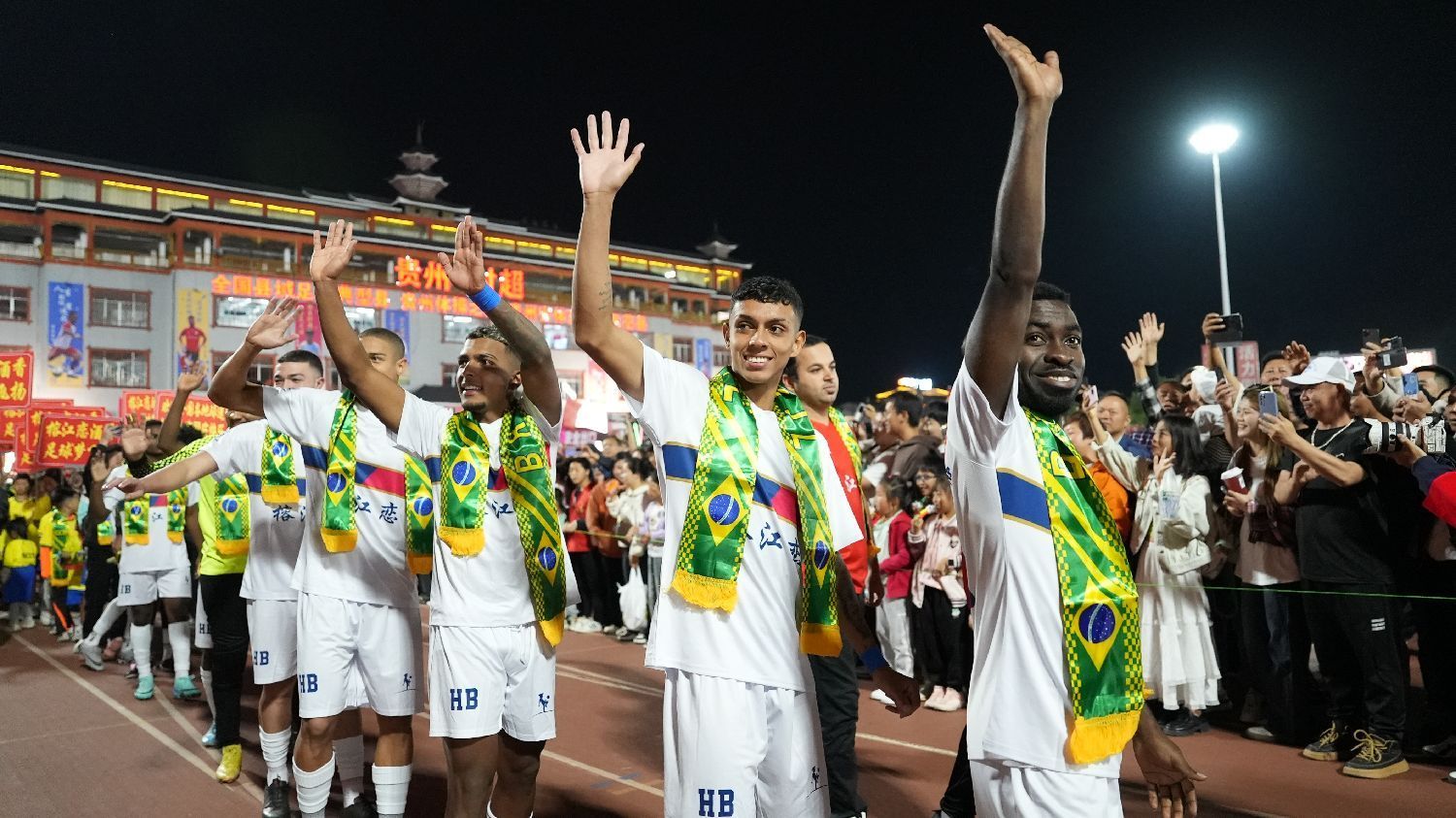 3日晚,在中国贵州省榕江县“村超”球场,来自“足球王国”巴西圣保罗高桥足球队的球员在现场观众的欢呼中,切身感受到中国乡村足球的快乐与激情。