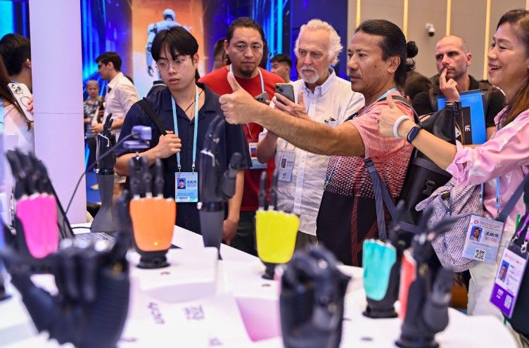 10月17日,广交会采购商与一款智能机械手互动。在广州举行的第138届中国进出口商品交易会(广交会)进口展第一期吸引约1.2万家企业参展,其中不少企业通过向采购商提供产品体验服务,展示产品性能特点,寻求商机。中新社