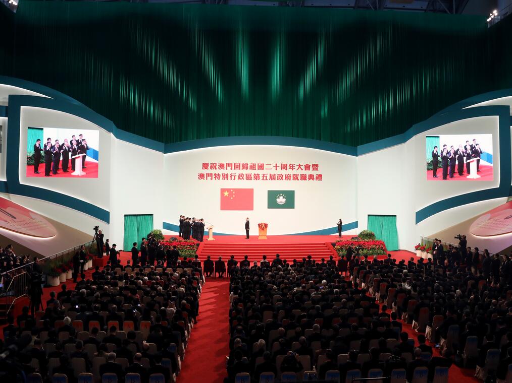 12月20日,庆祝澳门回归祖国20周年大会暨澳门特别行政区第五届政府就职典礼在澳门东亚运动会体育馆隆重举行。中新社
