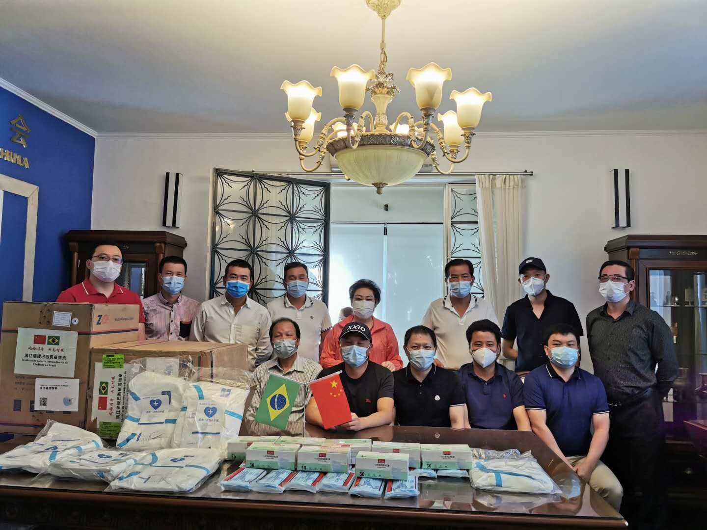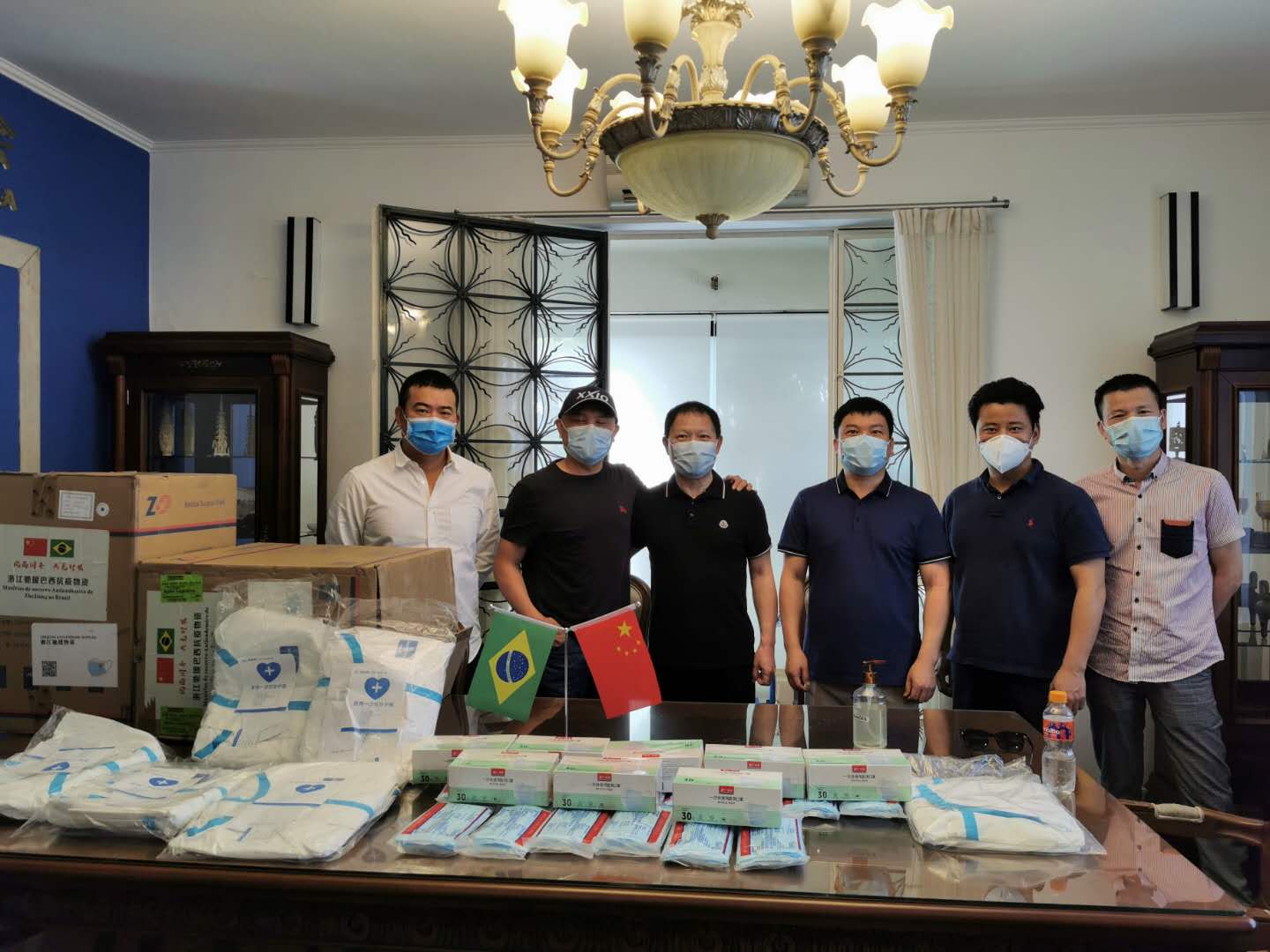 巴西温州同乡联谊会林海平会长、巴西青田同乡总会荣誉会长叶王永代表叶碎永会长、巴西金华同乡会章晓红会长、巴西台州商会(同乡总会)马希万理事长代表徐定伟会长,在仪式上接收了该批捐赠物资,他们并当场一致决定,将这批宝贵的物资再次捐赠出来,由巴西华人协会统筹,直接发放给圣保罗有需要的华人华侨和巴西友人,发放细节将公布在巴西华人协会网站和相关微信平台。