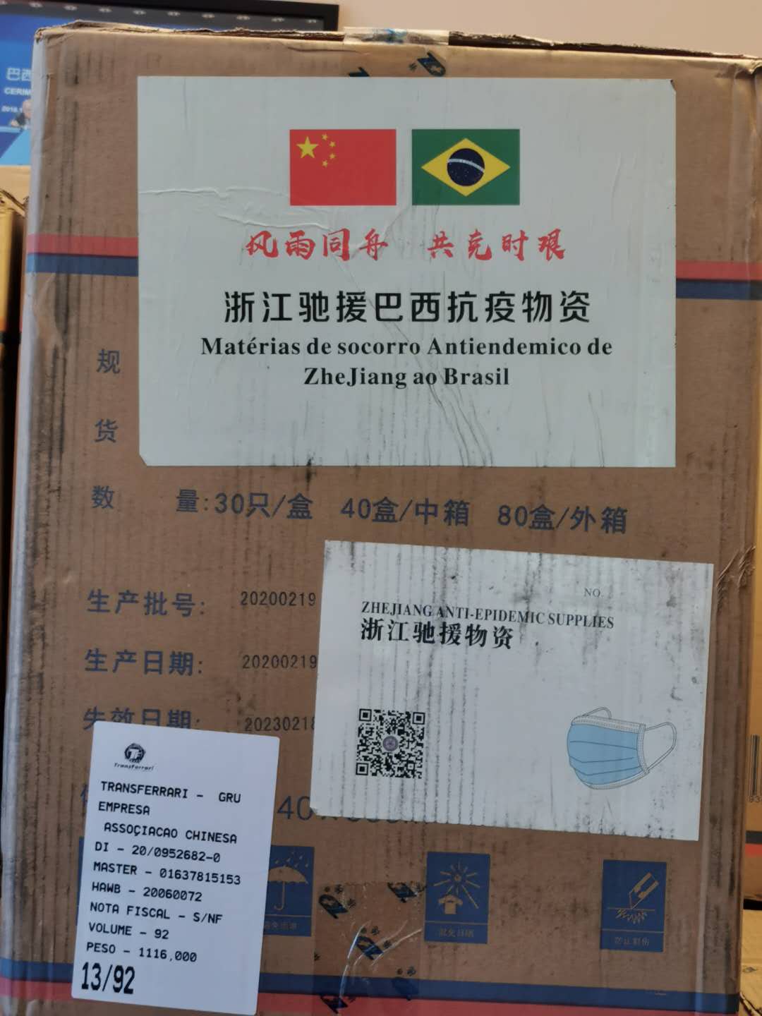 由浙江省政府、浙江省侨办和浙江省侨联捐赠的这批抗疫物资共92箱,包括42箱100800个普通口罩、25箱5万个外科口罩、25箱1千件防护服,总价值70多万雷亚尔。经巴西华人协会安排,其中45箱物资已于2日运抵里约巴中文化交流协会。