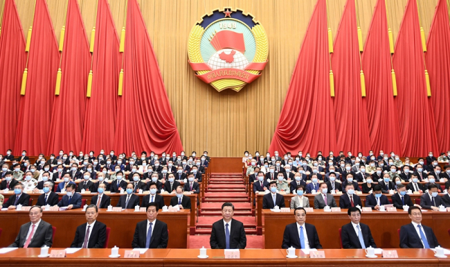 5月27日,中国人民政治协商会议第十三届全国委员会第三次会议在北京闭幕。图为习近平、李克强、栗战书、王沪宁、赵乐际、韩正、王岐山等在主席台就座。 新华社
