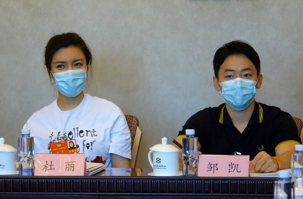 5月26日上午,出席中国全国政协十三届三次会议的体育界别委员在北京会议中心举行小组会议,讨论“两高”工作报告、民法典草案。图为全国政协委员、中国射击队步枪项目主教练杜丽(左),全国政协委员、四川体育职业学院运动管理中心主任邹凯参加小组会议。中新社记者 马秀秀 摄