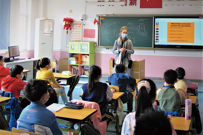 北京第二实验小学永定分校,Jessica在给五年级学生上英语课。南美侨报特约记者程星天