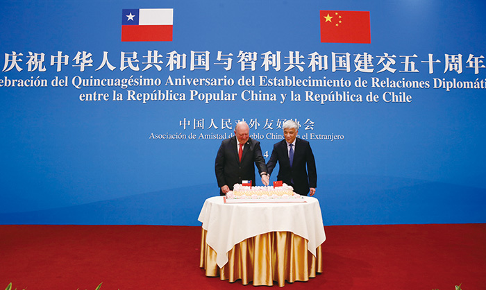 12月4日,中国人民对外友好协会在北京钓鱼台国宾馆举办庆祝中国智利建交50周年招待会。图为全国人大常委会副委员长丁仲礼同智利驻华大使施密特共切庆祝蛋糕。