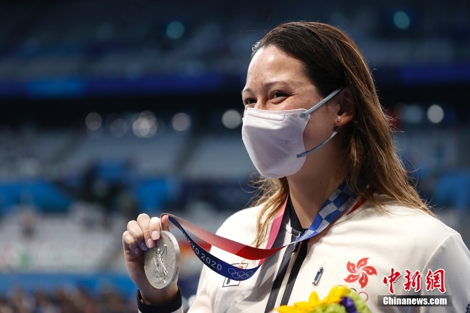 7月30日,中国香港选手何诗蓓在女子100米自由泳决赛后庆祝摘银。当日,东京奥运会游泳比赛女子100米自由泳决赛在东京水上运动中心举行,中国香港选手何诗蓓以52秒27摘得银牌。