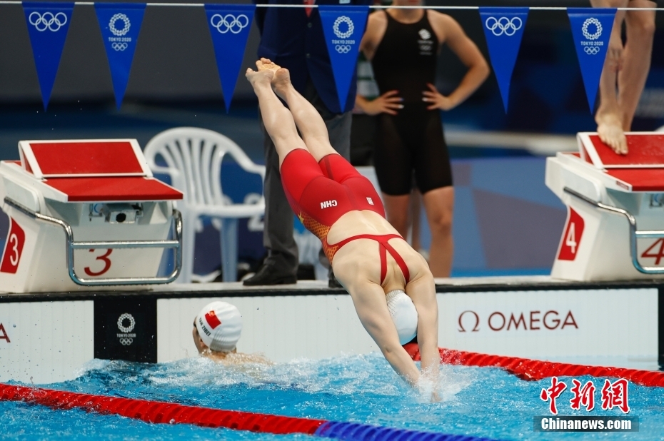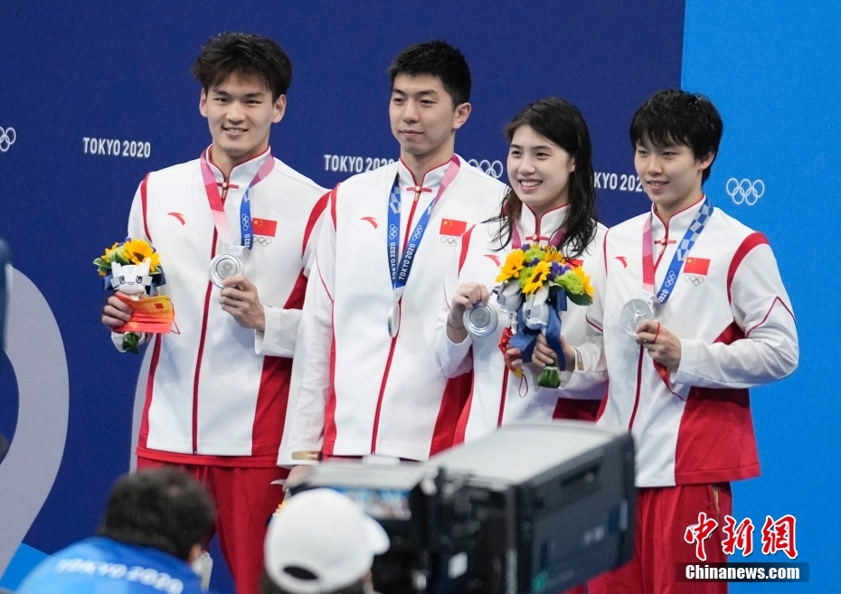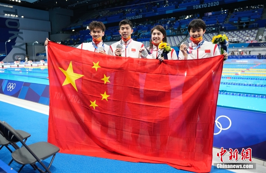 北京时间7月31日,东京奥运会4×100米男女混合泳接力决赛,徐嘉余、闫子贝、张雨霏、杨浚瑄组成的中国队以3分38秒86的成绩摘得一枚银牌,中国队收获4×100米男女混合泳接力项目的首枚奖牌。图为中国队队员展示银牌。