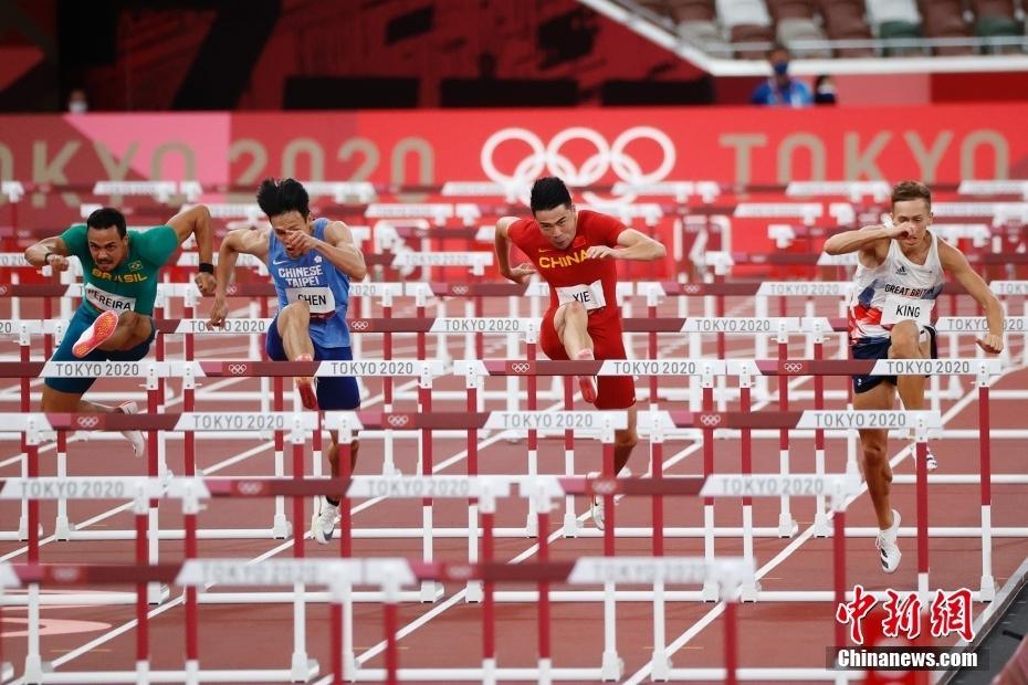 8月3日,东京奥运会男子110米栏开赛,谢文骏在预赛中跑出13秒51,以小组第四晋级半决赛。图为谢文骏在比赛中。