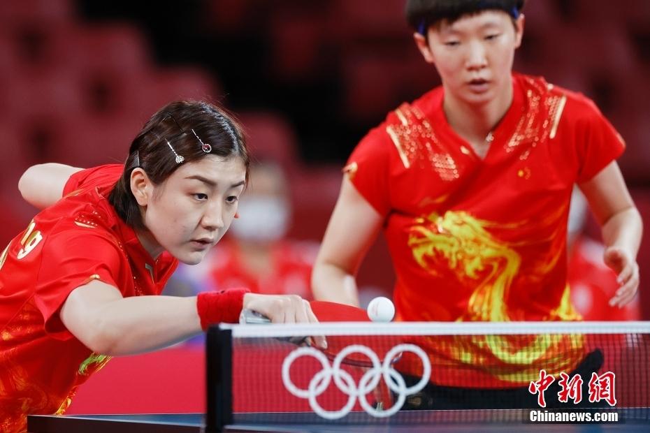 8月3日,中国队球员陈梦(左)/王曼昱在比赛中。当日,东京奥运会举行乒乓球女子团体比赛,中国队战胜新加坡队,晋级四强。