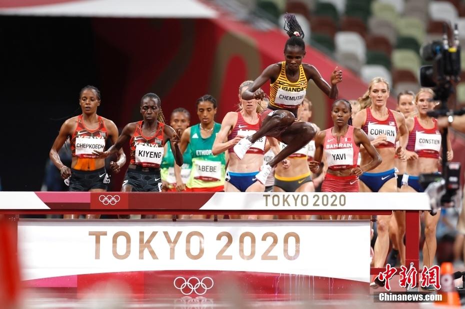 8月4日,乌干达选手切穆泰(CHEMUTAI)(黄色上衣)在田径女子3000米障碍决赛中。当日,东京奥运会田径女子3000米障碍决赛在东京新国立竞技场进行,乌干达选手切穆泰以9分01秒45夺冠。