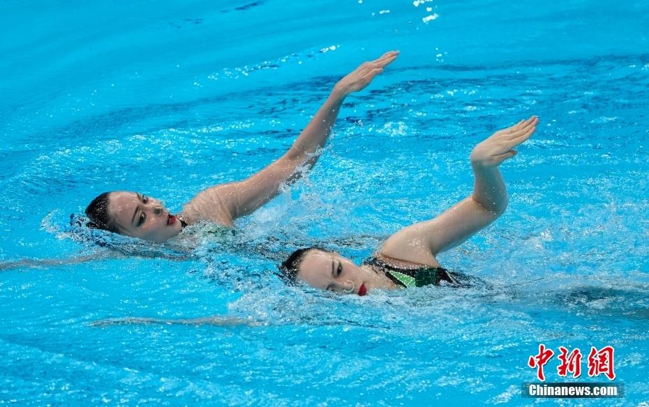 8月4日,东京奥运会花样游泳双人自由自选决赛进行,中国组合黄雪辰/孙文雁得到96.9000分,加上此前的技术自选得分,最终她们以192.4499分夺得亚军,俄罗斯奥运组合夺得冠军。图为黄雪辰/孙文雁在比赛中。