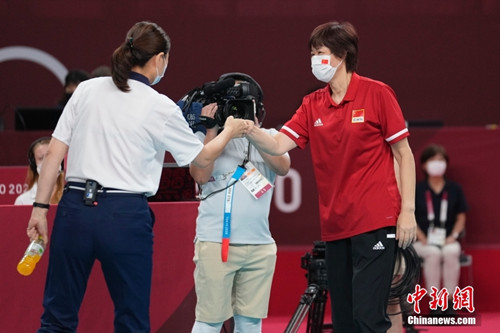 8月2日比赛结束后,郎平向裁判碰拳致意。中新社