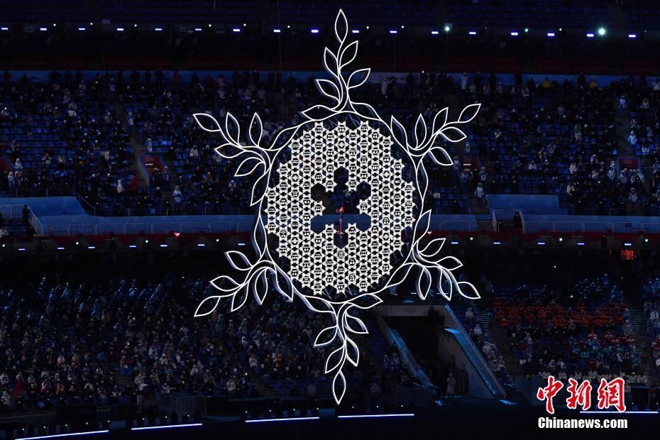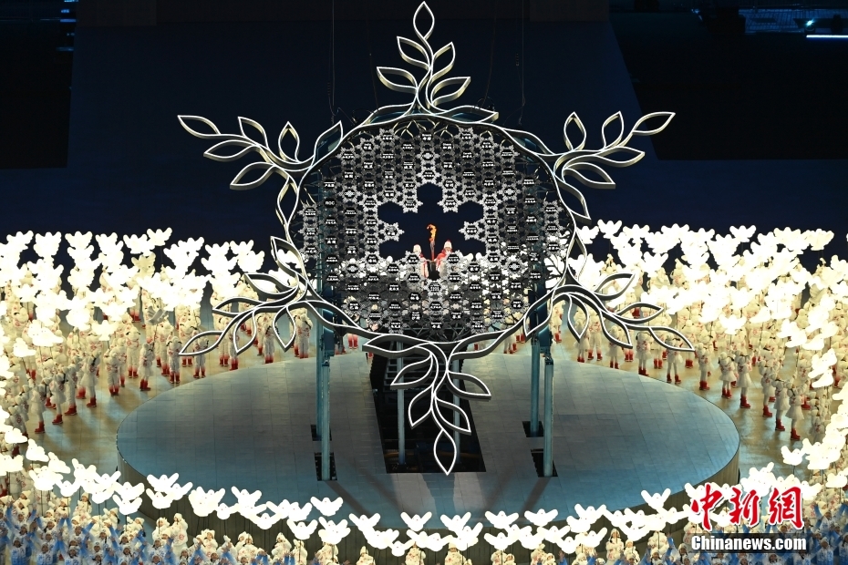 开幕式突出全人类共有的精神和理念,一起向未来,是“我们”一起向未来。图为两位运动员将最后一棒火炬留在“大雪花”中心。 中新社记者 毛建军 摄