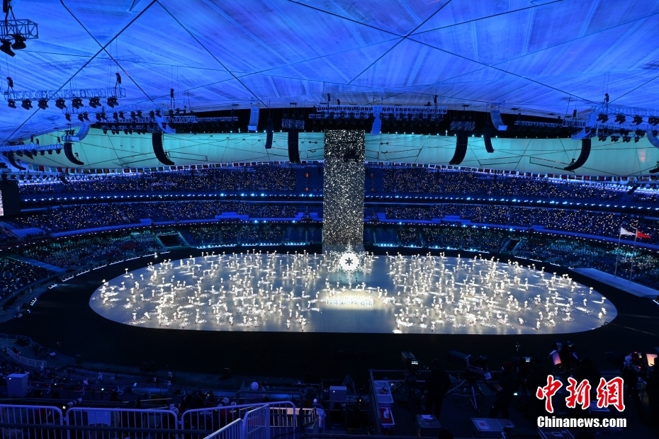 2022年2月4日晚,2022年北京冬奥会开幕式正式拉开帷幕。继北京2008年奥运会后,奥林匹克会旗时隔14年再次在国家体育场“鸟巢”升起。图为开幕式上的“雪花”环节。