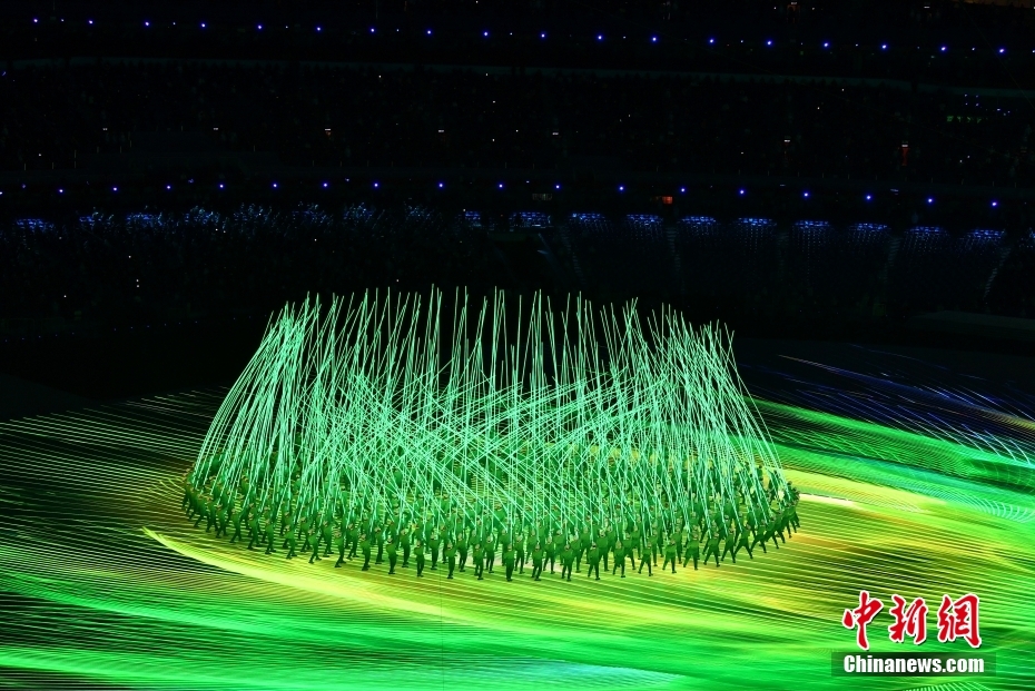 开幕式突出全人类共有的精神和理念,一起向未来,是“我们”一起向未来。图为世界各地的76位年轻人并肩向前。中新社记者 崔楠 摄
