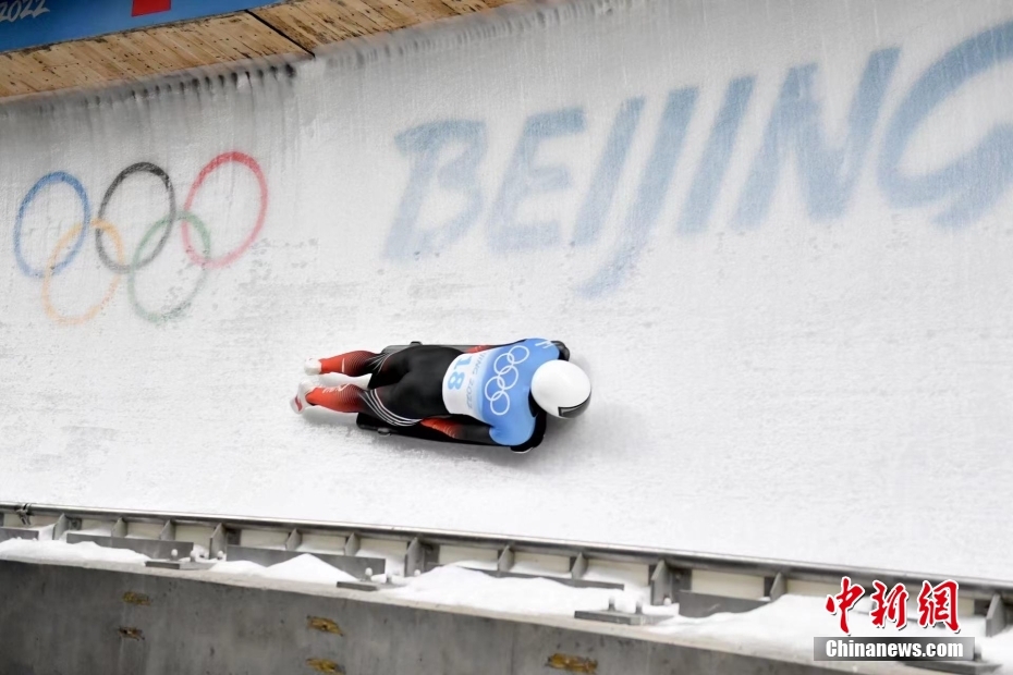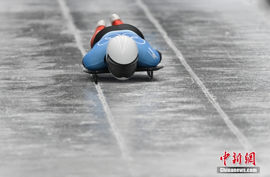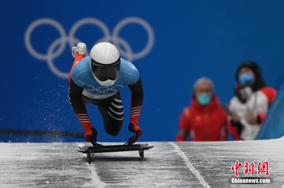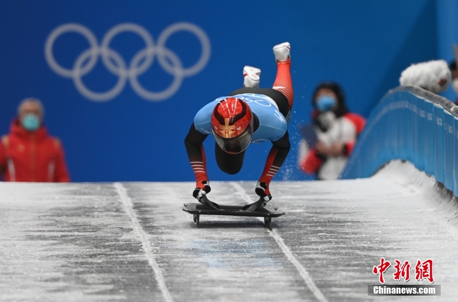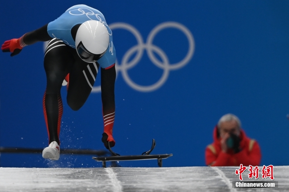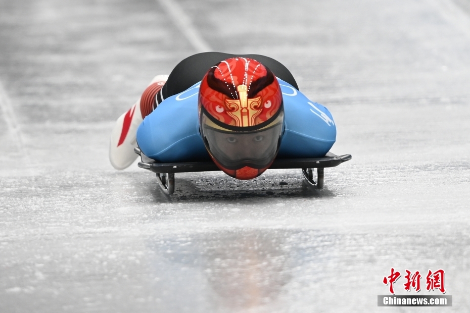 11日,北京2022年冬奥会男子钢架雪车比赛在国家雪车雪橇中心举行。中国选手殷正取得第五名的成绩。图为中国队选手殷正在比赛中出发。 中新社记者