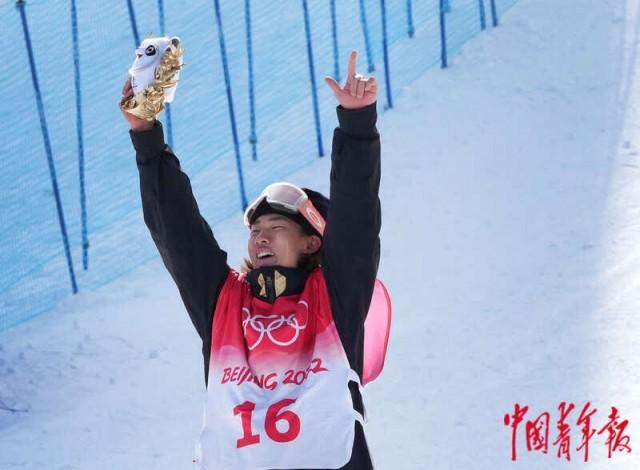 2月7日,河北张家口云顶滑雪公园,北京冬奥会单板滑雪男子坡面障碍技巧决赛结束后,苏翊鸣在赛后仪式上获颁“冰墩墩”。中国青年报