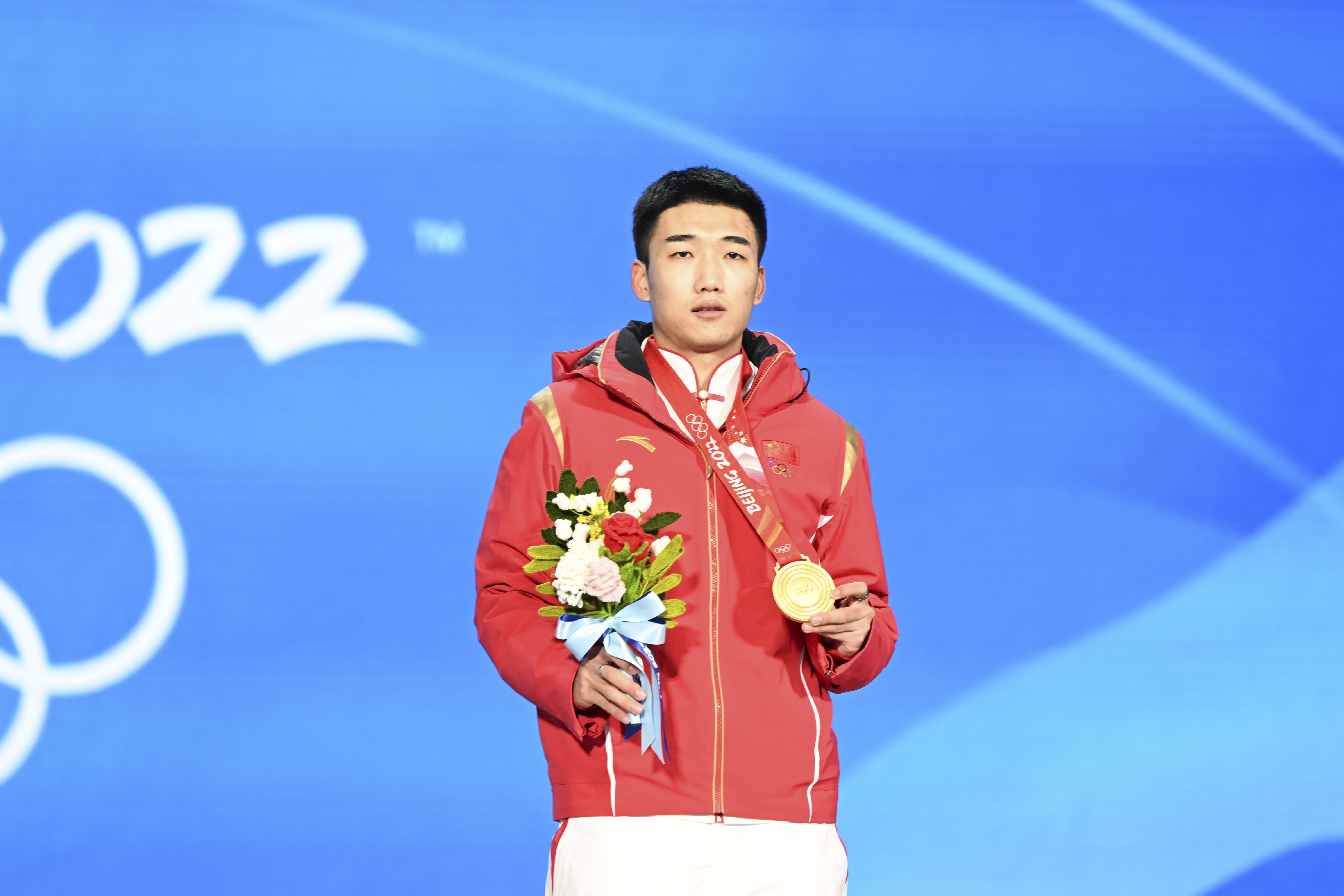2月12日,北京2022年冬奥会速度滑冰男子500米决赛在国家速滑馆“冰丝带”举行。中国选手高亭宇以34.32秒的成绩打破奥运会纪录,夺得冠军。这是中国首次在冬奥会速度滑冰男子项目获得金牌。图为高亭宇在颁奖仪式上。 中新社记者 李骏 摄