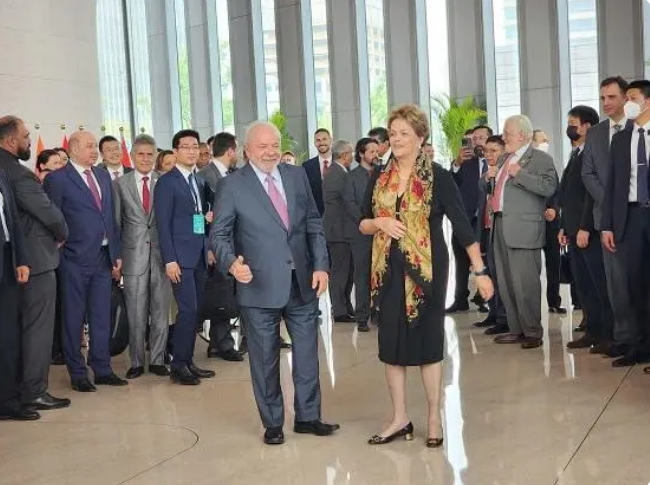 4月13日,巴西总统卢拉访问新开发银行总部,与新开发银行行长罗塞夫在一起。图源:卢拉推特