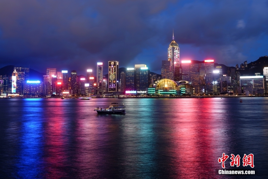 6月29日晚,香港维多利亚港两岸灯光璀璨,多栋大厦外墙上庆祝香港回归25周年的灯饰格外醒目。中新网