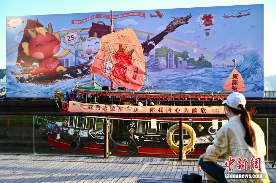 6月28日,香港观塘民政事务处、九龙东区各界联会主办的庆祝香港特区成立25周年“十全十美庆回归”系列活动,在观塘的维多利亚港海上展示一件高10米、长30米的“同谱新篇 东龙出海”巨型立体艺术画庆回归。图为观塘的巨型立体艺术画亮灯。