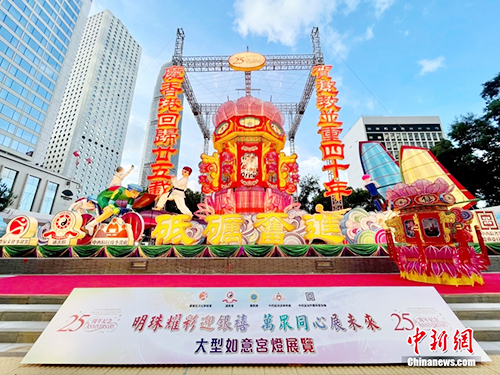 近日,香港各地随处可见庆祝回归25周年的横幅、海报等,喜庆气氛浓。图为6月26日,香港特区政府康乐及文化事务署、惩教署、中西区各界庆典委员会等联合在中环举办“明珠耀彩迎银禧 万众同心展未来”大型如意宫灯展览,庆香港回归祖国25周年。图为中环的大型如意宫灯展览。中新网