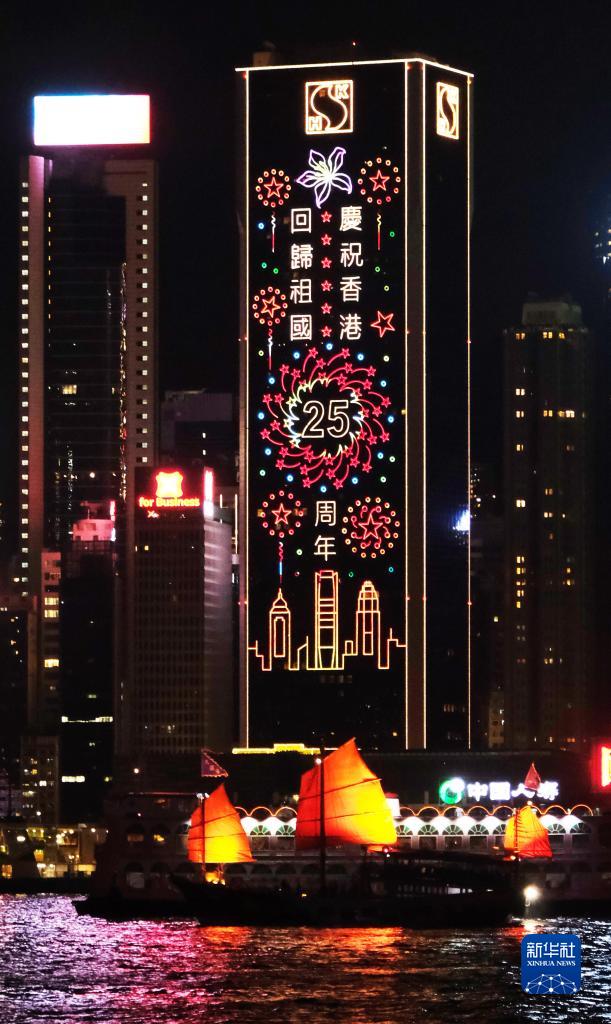 随着香港回归祖国25周年纪念日的临近,香港喜庆气氛越来越浓。图为6月25日在香港尖沙咀拍摄的灯光秀。新华网