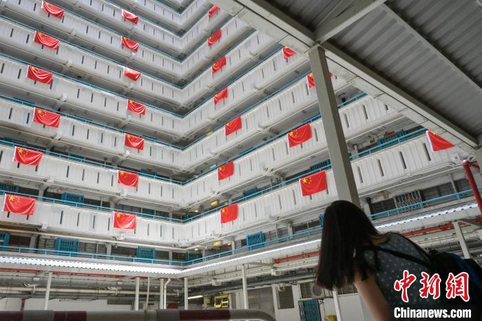 6月25日,香港九龙东各地随处可见庆祝香港回归25周年的横幅、海报等,喜庆气氛浓。图为香港坪石邨一住宅楼挂满国旗。中新网