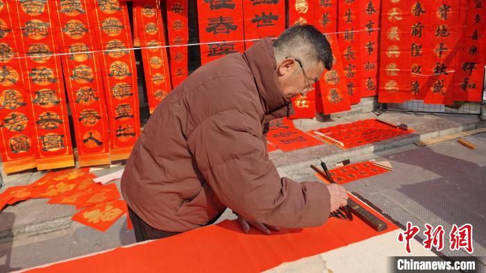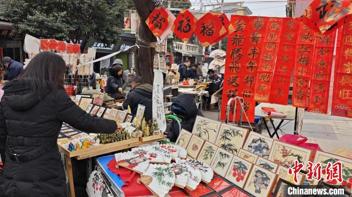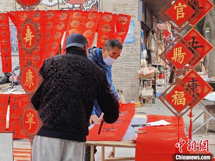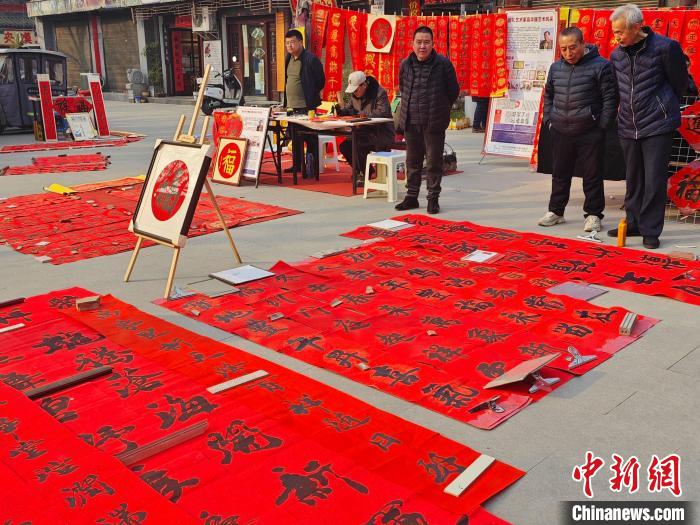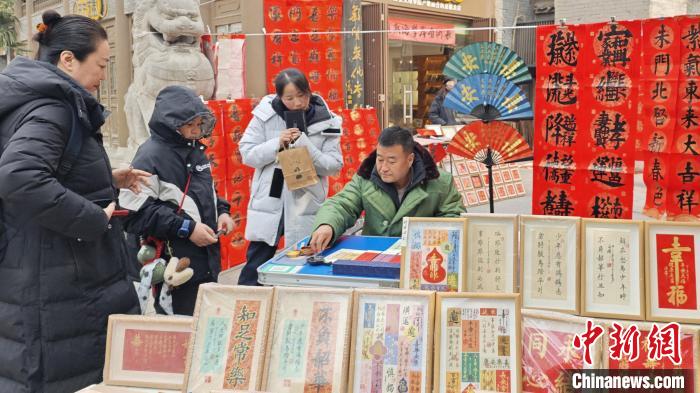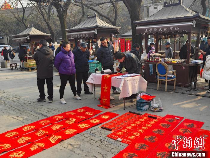 近日,随着农历新年将至,位于西安城墙根下的书院门街区里,沿街摆出了不少售卖春联、“福”字等商品的摊位,吸引当地民众到此挑选年货。 图为西安书院门里售卖春联的摊位。
