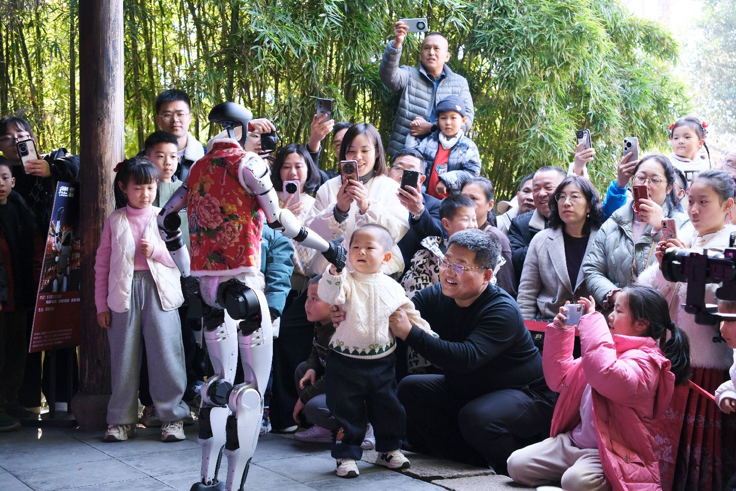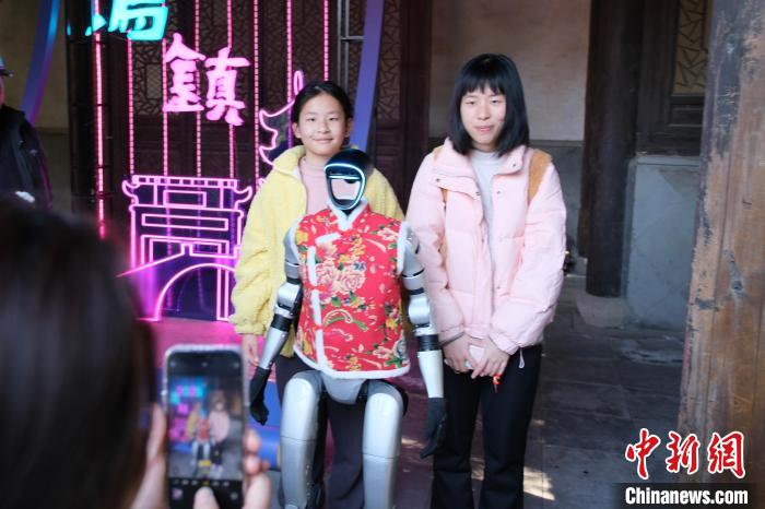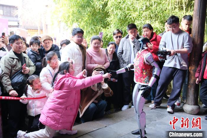 春节期间,浙江嘉兴乌镇景区内,机器人拜年表演吸引民众感受智慧乌镇的科技年味。图为1月30日,机器人与小朋友握手互动。中新社