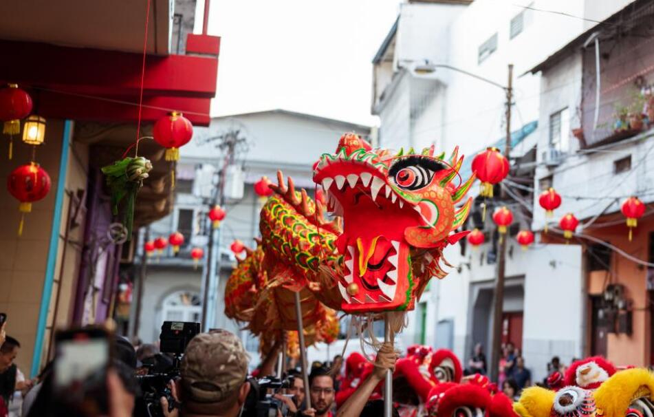 1月29日,在巴拿马首都巴拿马城的唐人街,人们进行舞龙舞狮表演。2021年11月,中国农历新年成为巴拿马全国性节日。