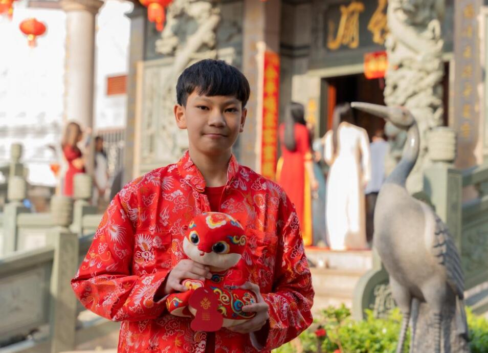 1月29日,在老挝首都万象,一名男孩拿着蛇年玩偶在福德庙祈福迎春。