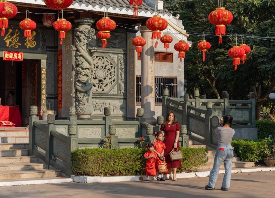 1月29日,在老挝首都万象,当地民众在福德庙祈福迎春。