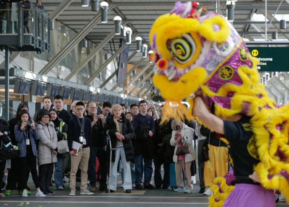 1月29日,在加拿大里士满,人们在温哥华国际机场欣赏舞狮表演。