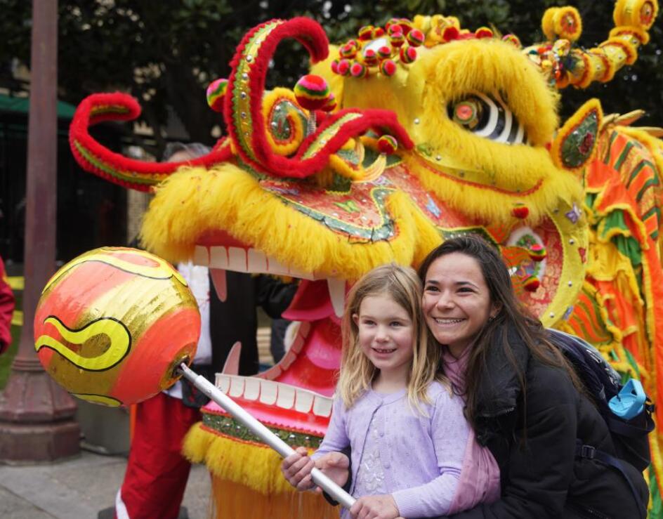 1月29日,在美国旧金山唐人街,一对母女与舞龙队伍合影。