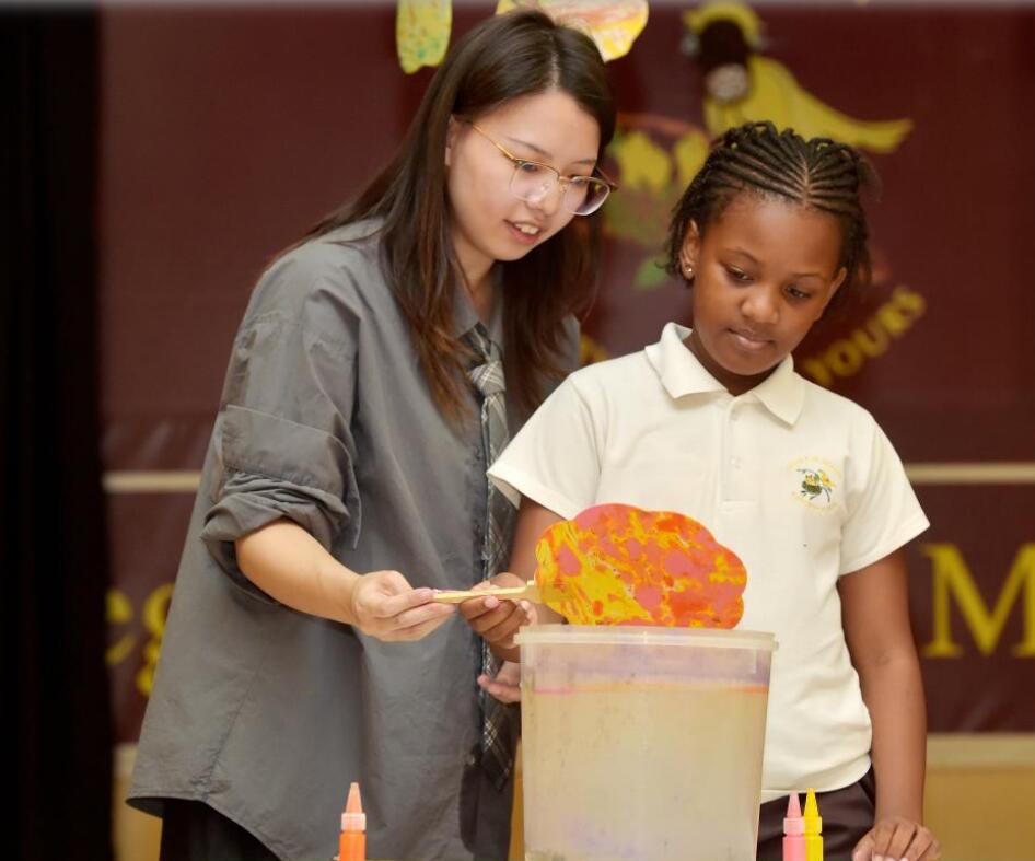 1月29日,在博茨瓦纳首都哈博罗内的丽海国际小学,当地学生体验制作中国漆扇。
