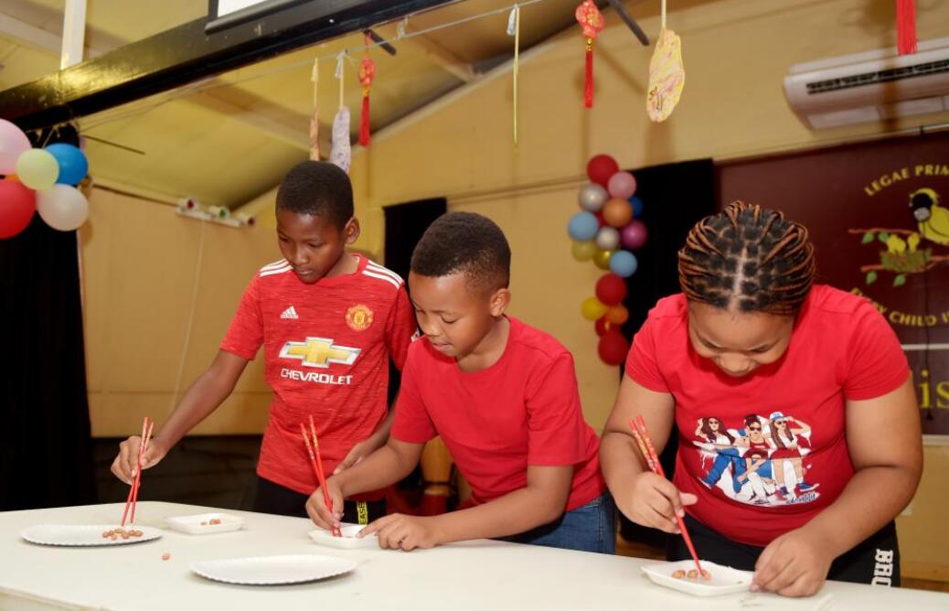 1月29日,在博茨瓦纳首都哈博罗内的丽海国际小学,当地学生参加筷子夹花生游戏。