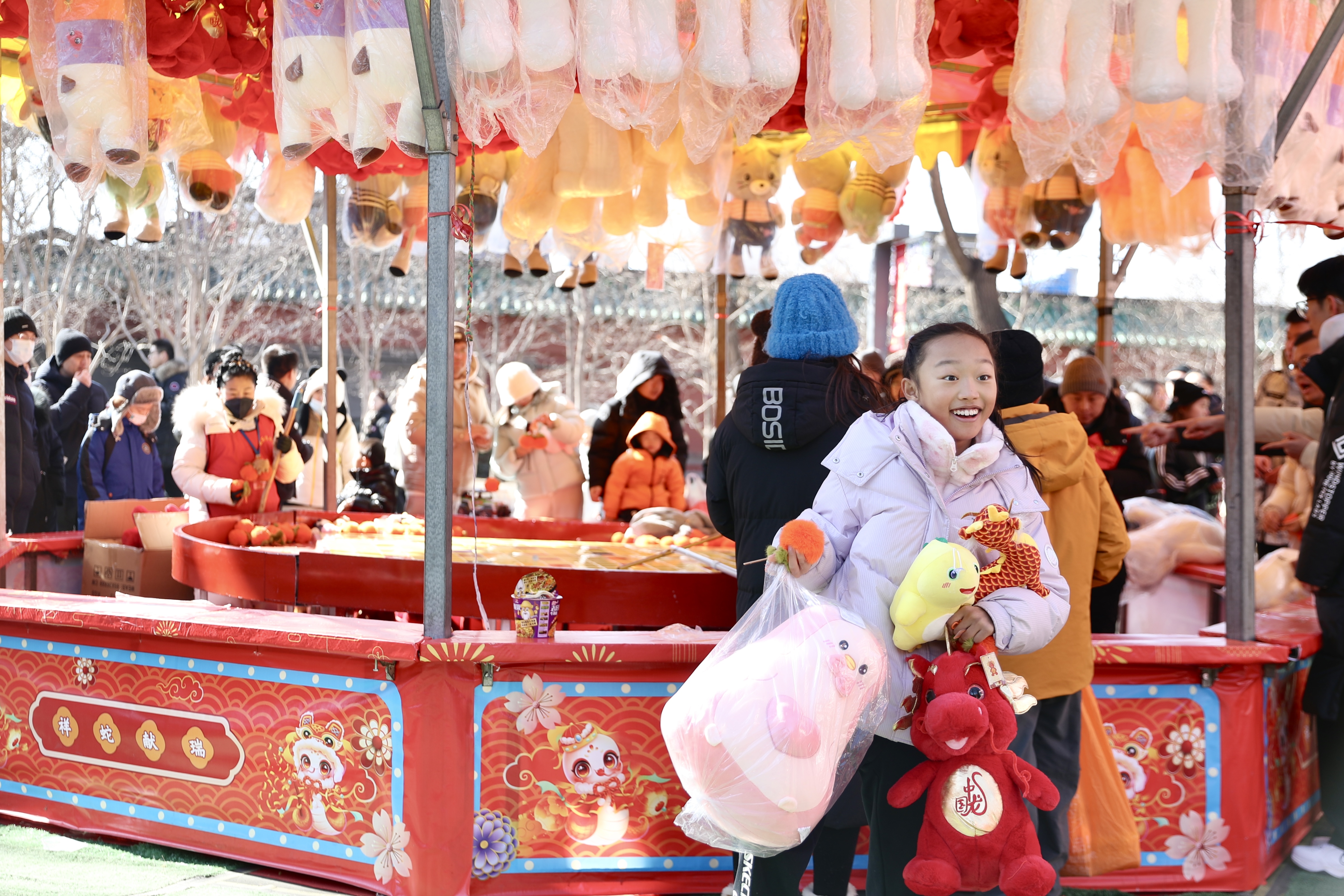 2月4日,北京龙潭庙会,小朋友手捧互动游戏的奖品。中新社