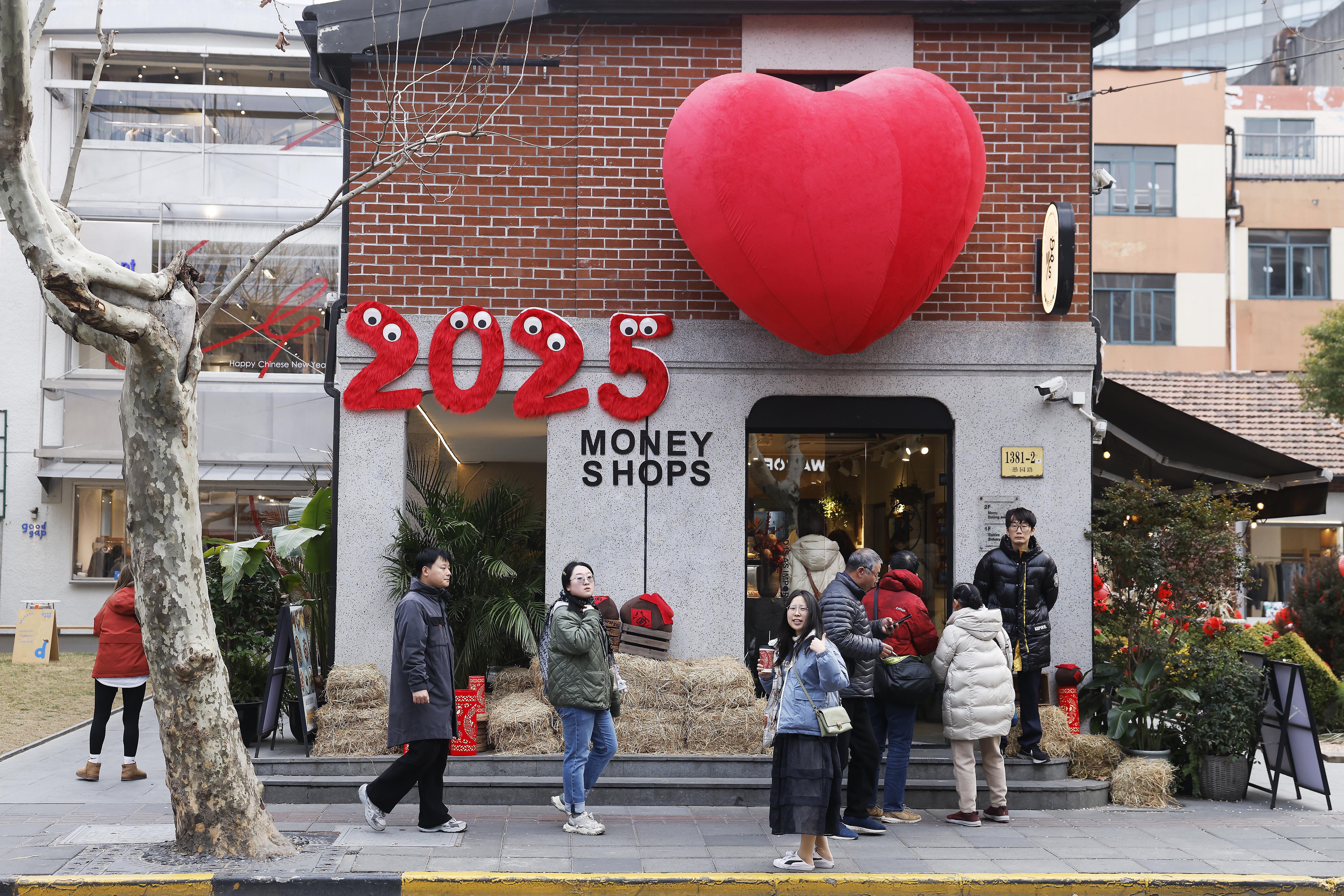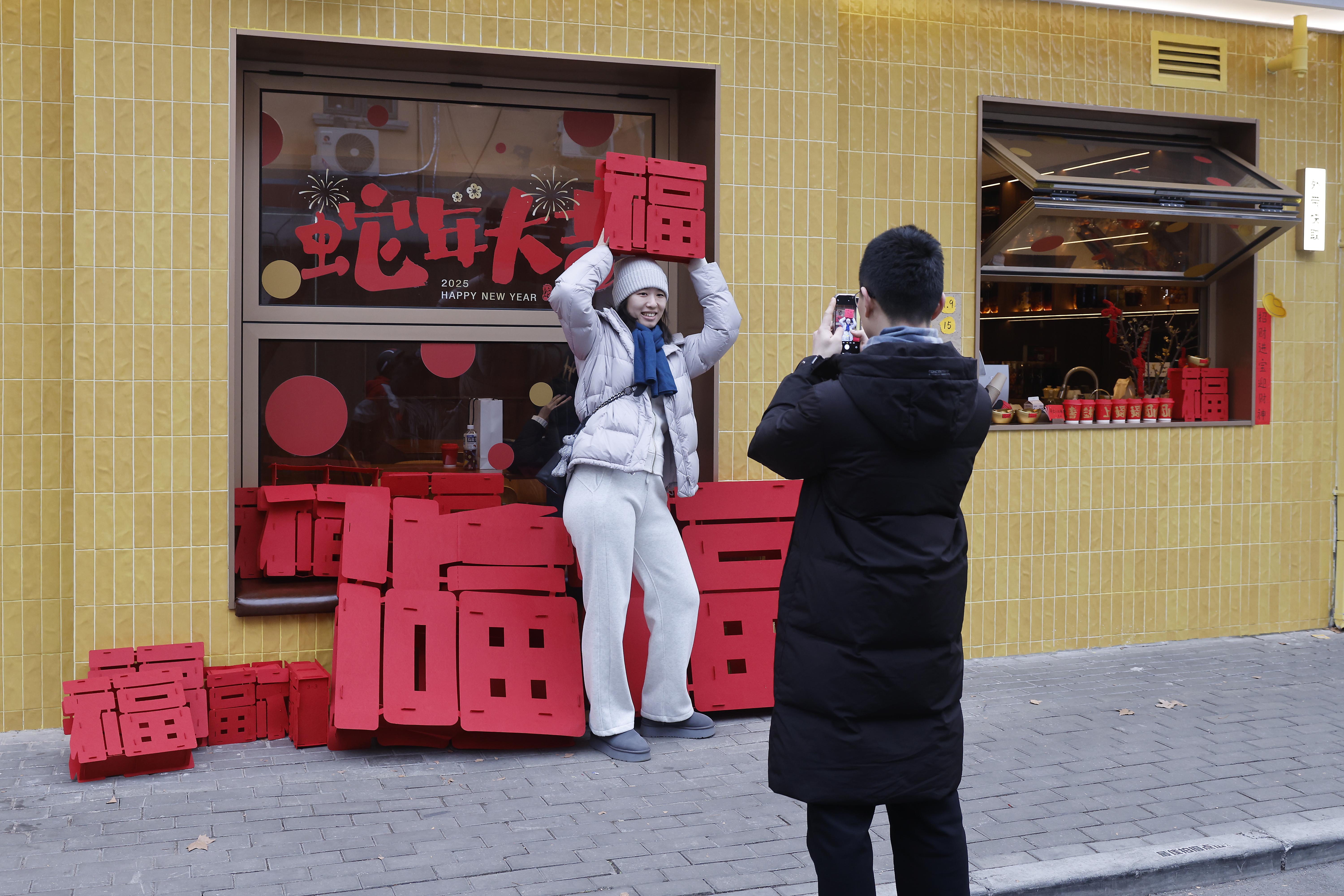 2月4日,游客行走在上海市长宁区愚园路街头,并与新春装饰合影。中新社
