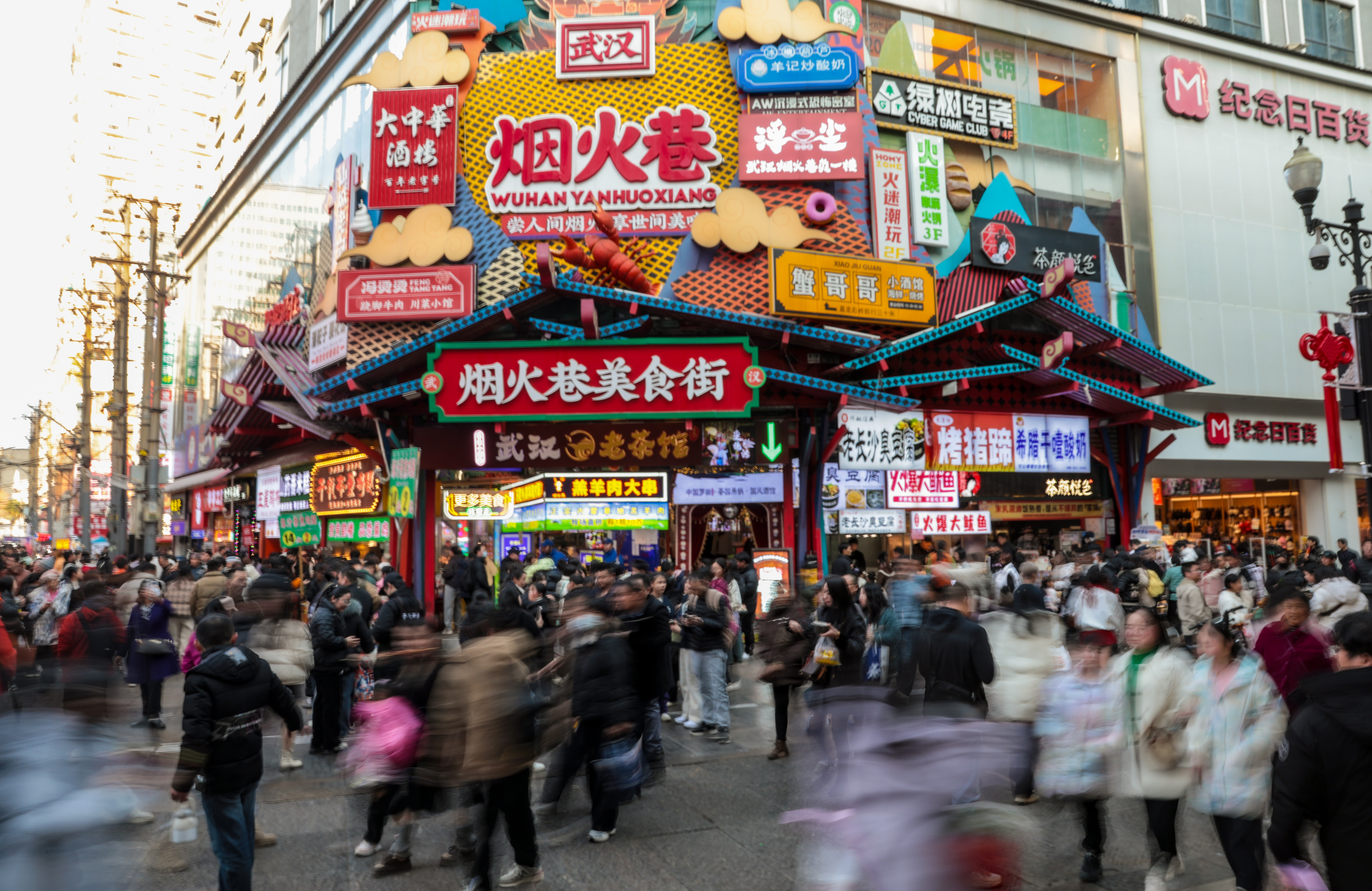 2月4日,众多游客在湖北武汉江汉路步行街上游玩。中新社
