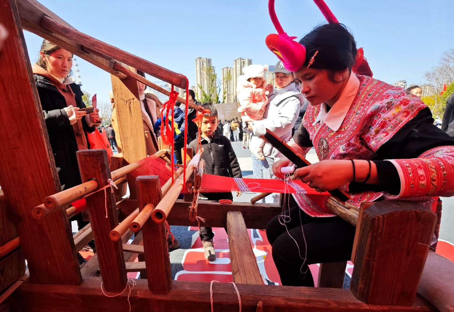 2月9日,“万巳如意福映海峡”2025年元宵节海峡两岸民俗文化活动在福建福州举行,两岸同胞齐聚,“花式”闹元宵。图为福州市罗源县畲族苎布织染缝纫技艺吸引市民。中新社