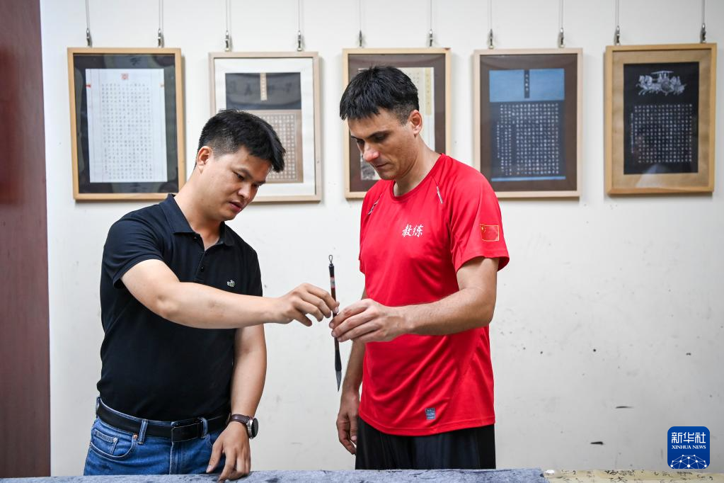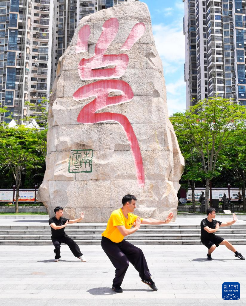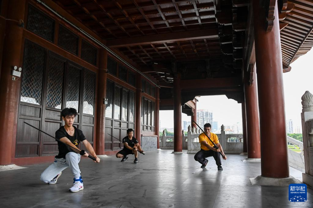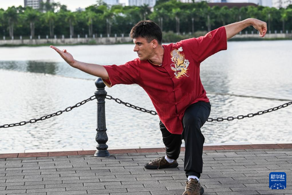 业余时间,莫小龙喜欢骑行、品茶、学习书法。他也时常向广西南宁当地的中医请教,借机学习中医诊疗技艺。他在社交媒体开设了个人账号,分享自己学习中国武术和中医文化的心得,收获了不少海外“粉丝”。“中国传统文化真是太有魅力了,我要不断地学下去。”莫小龙说。今年是中国与巴西建交50周年,莫小龙希望自己能做中国和巴西两国人民之间的“文化使者”,让中国的传统文化被更多巴西人知道。图为莫小龙(右一)和武术同仁在南宁畅游阁练习苗刀(7月6日摄)。