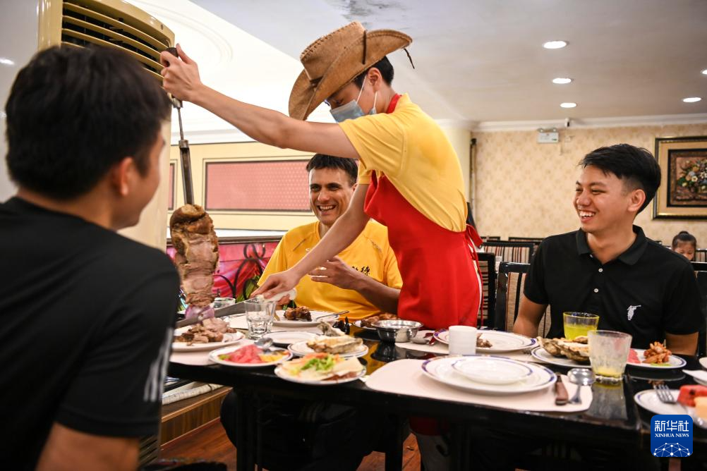 莫小龙(左二)和友人在南宁市一家餐厅品尝巴西烤肉(7月6日摄)。