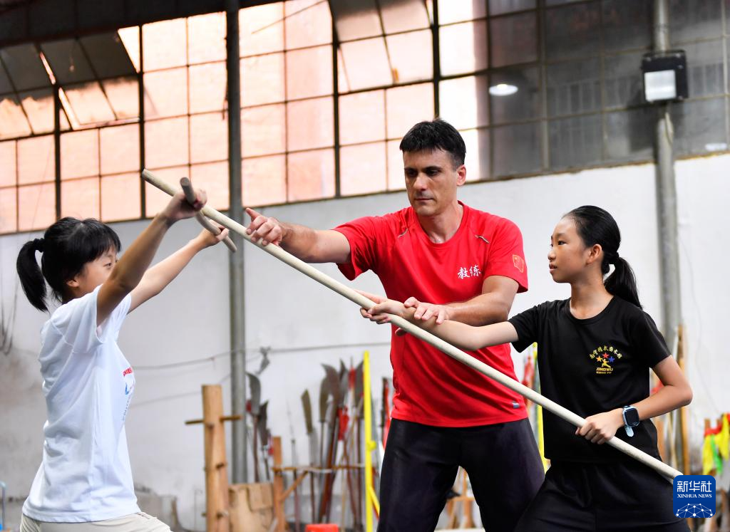 莫小龙原名加布里埃尔·德·莫拉斯,1978年出生,来自巴西里约热内卢,是广西南宁一家武馆的武术教练。青年时期的莫小龙因受功夫巨星李小龙的影响,自1999年起开始接受系统的中国武术训练。随着对中国武术及中国传统文化的日益了解,他给自己取了一个中国名字——莫小龙。图为莫小龙指导学生武术动作(7月6日摄)。