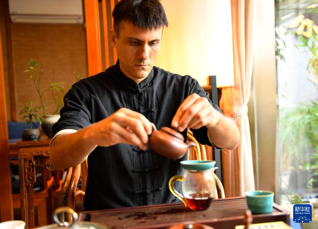 7月9日,莫小龙在南宁市一家茶馆沏茶。